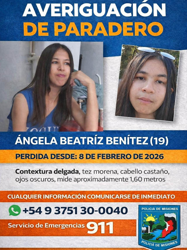 La denuncia fue radicada el 12 de febrero a las 15:45 por Laura Graciela Morel, de 46 años, domiciliada en el barrio San Cayetano, quien manifestó que su hija, Ángela Beatriz Benítez, se retiró de la vivienda entre las 4:00 y las 6:00 horas del 8 de febrero, desconociéndose hasta el momento su paradero.