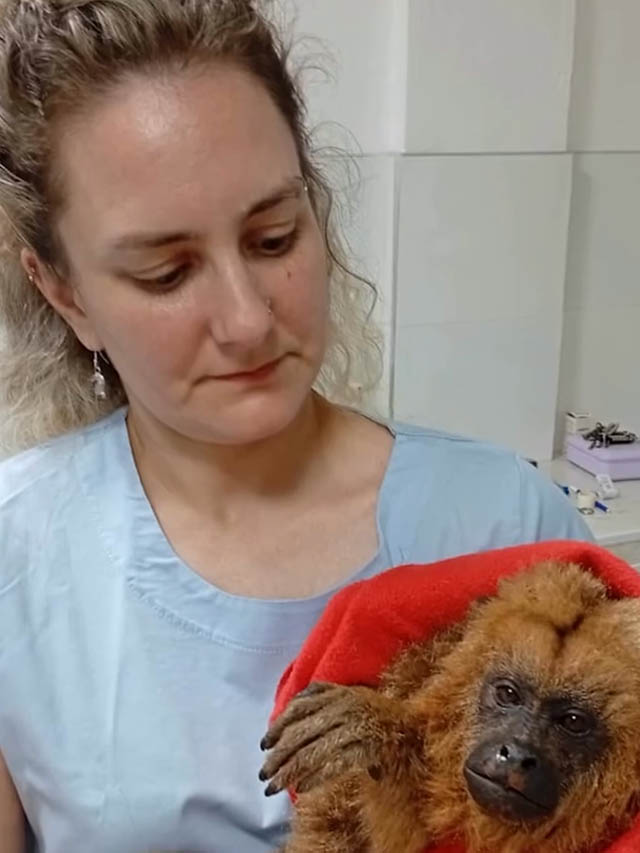 El animal fue hallado tras el aviso de vecinos de la zona, quienes alertaron sobre su estado. Al momento de su ingreso al centro de rehabilitación, la mona carayá (Alouatta caraya) presentaba quemaduras en el lateral del cuerpo, el rostro y las extremidades.